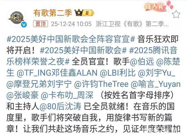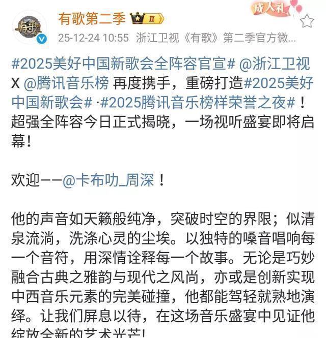 2025美好中国新歌会全阵容官宣,周深、陈楚生、刘宇宁、伯远等优秀艺人,榜上有名!