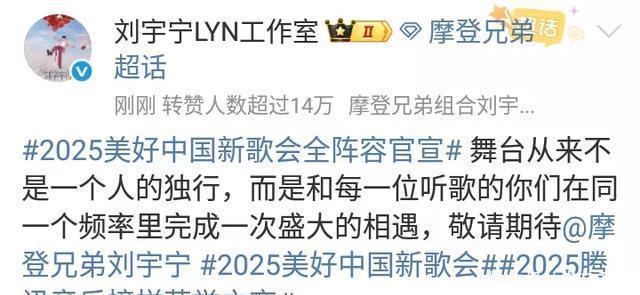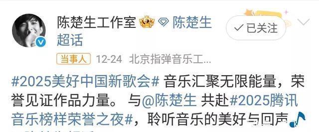 “以独特的嗓音唱响每一个音符,用深情诠释每一个故事。” 这就是歌手周深的优势所在! 事实上,歌手周深的好声音,一直以来深受观众的喜欢! 也正因为歌手周深的歌声,成为舞台最强音。 所以,歌手周深参加的综艺,观众关注度非常高! 尤其是周深演唱会,出现了人气高涨的一幕! 所以,歌手周深的演出资源越来越好,正是源于他个人优秀的唱功,以及优秀的舞台表现力! 值得一提的是,歌手陈楚生也成为2025美好中国新歌会的演出艺人! 陈楚生身穿黑色的西装,被官宣海报定格,看起来帅气十足! 陈楚生工作室在社交平台发文:“音乐汇聚无限能量,荣誉见证作品力量。” 这就是歌手陈楚生的优秀所在! 好音乐,好声音,好舞台,好祝福! 进一步来看,歌手陈楚生在2025年参加了很多舞台的演出! 在《歌手2025》综艺舞台上,歌手陈楚生通过不懈努力,最后获得歌王的荣誉称号! 歌王对于陈楚生来说,或许就是一种歌手实力的证明! 从歌手到歌王,这背后的辛苦付出,便是成功的关键所在! 此次参与新舞台演出,既是他延续歌王优势的证明,又是歌手传递祝福的新途径! 还应该看到的是,艺人刘宇宁的官宣海报,感人至深! 高大的身材,帅气的形象,还有他微笑的表情,再现了摩登兄弟刘宇宁的美好形象! 刘宇宁工作室在社交平台发文,令人回味无穷! “舞台从来不是一个人的独行,而是和每一位听歌的你们在同一个频率里完成一次盛大的相遇。” 这就是歌手和舞台的缘分!是相遇,也是共赢! 观众追星明星艺人,舞台的作用功不可没!